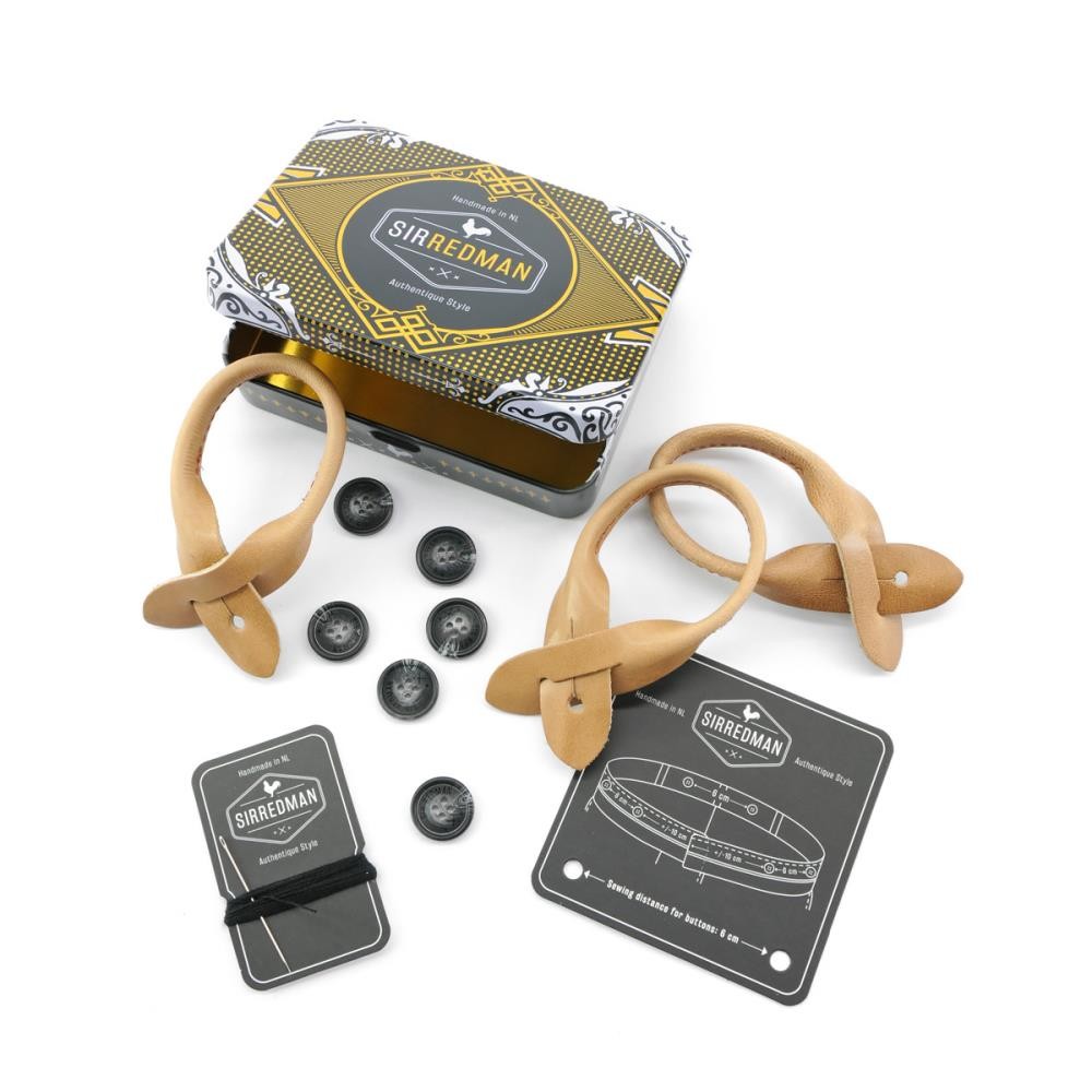 PROUDLY MADE BY HAND IN THE NETHERLANDS Sir Redman maakt zijn bretels volledig met de hand in eigen huis. Deze bretels zijn voorzien van de beste kwaliteit lederen lussen en stevige clips. Ook zijn ze in maat verstelbaar met schuifklemmen. Met het speciaal meegeleverde blikje met 6 knopen, naald & draad en een afstand bepaler om de knopen aan de binnenkant van je broek te bevestigen, is het heel eenvoudig om je bretels op de authentieke manier te dragen. Ben je daar niet zo van? Gebruik dan de hoogwaardige clips om deze aan je broekrand te klemmen. Ze zijn nl. los van elkaar afneembaar. Gebruik je de lussen niet? Bewaar ze dan in het blikje: handig toch?