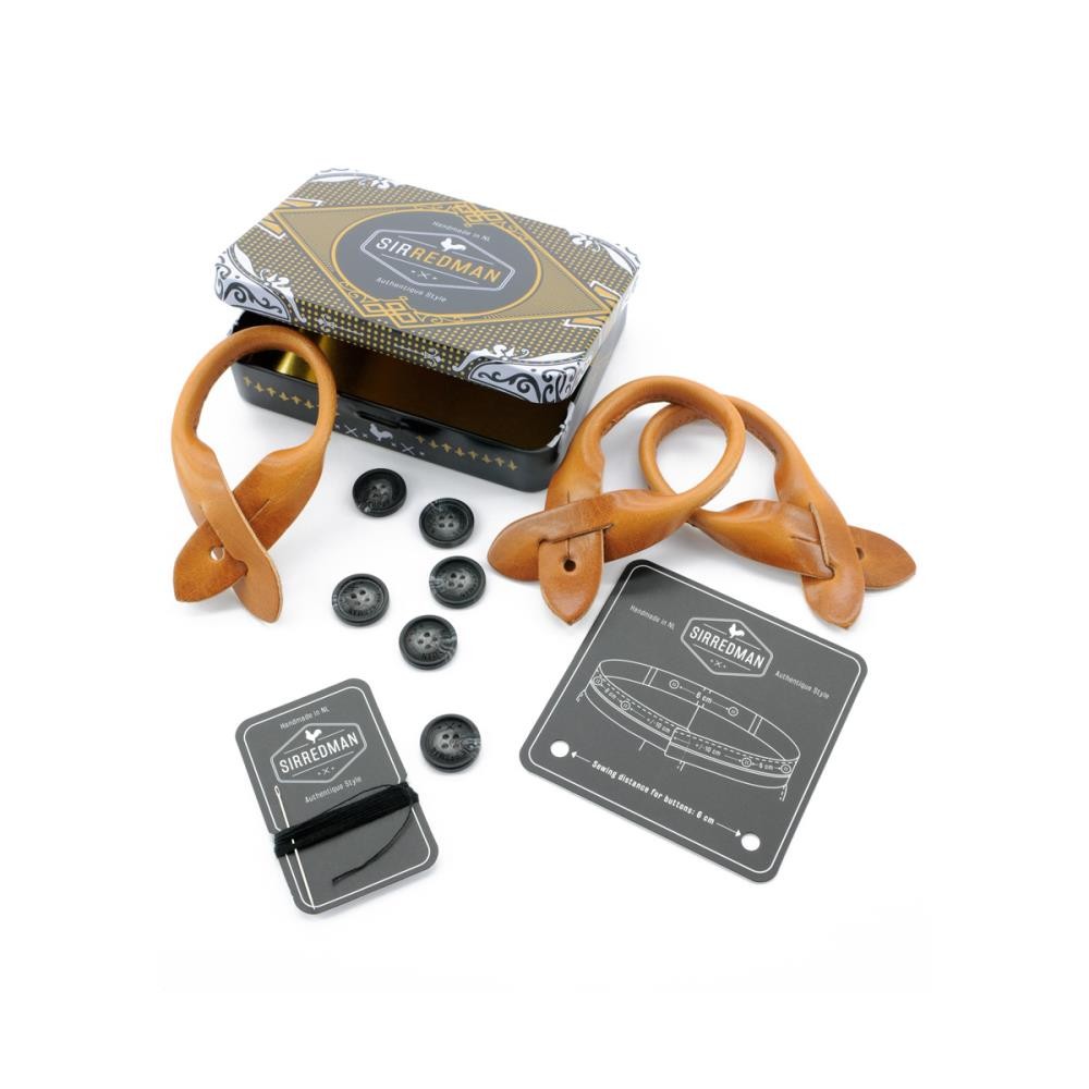 PROUDLY MADE BY HAND IN THE NETHERLANDS Sir Redman maakt zijn bretels volledig met de hand in eigen huis. Deze bretels zijn voorzien van de beste kwaliteit lederen lussen en stevige clips. Ook zijn ze in maat verstelbaar met schuifklemmen. Met het speciaal meegeleverde blikje met 6 knopen, naald & draad en een afstand bepaler om de knopen aan de binnenkant van je broek te bevestigen, is het heel eenvoudig om je bretels op de authentieke manier te dragen. Ben je daar niet zo van? Gebruik dan de hoogwaardige clips om deze aan je broekrand te klemmen. Ze zijn nl. los van elkaar afneembaar. Gebruik je de lussen niet? Bewaar ze dan in het blikje: handig toch?