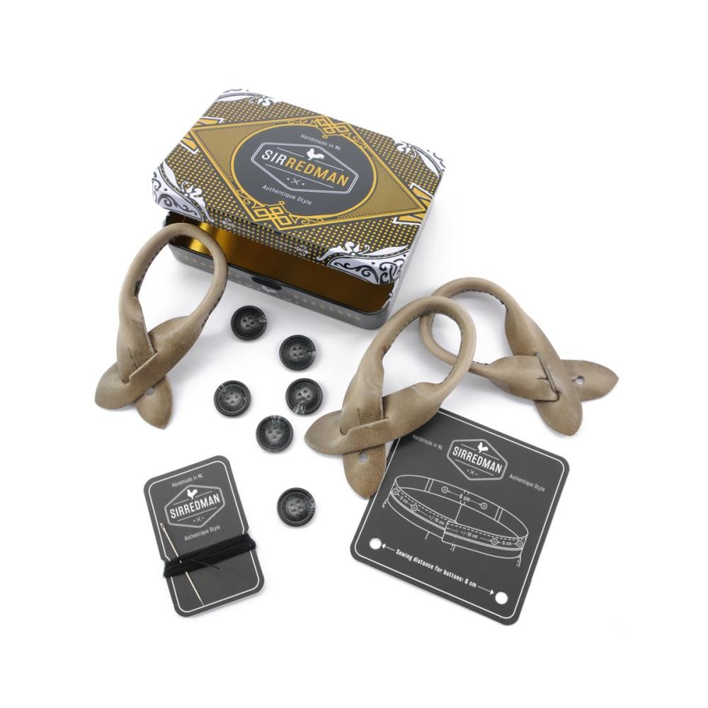 PROUDLY MADE BY HAND IN THE NETHERLANDS Sir Redman maakt zijn bretels volledig met de hand in eigen huis. Deze bretels zijn voorzien van de beste kwaliteit lederen lussen en stevige clips. Ook zijn ze in maat verstelbaar met schuifklemmen. Met het speciaal meegeleverde blikje met 6 knopen, naald & draad en een afstand bepaler om de knopen aan de binnenkant van je broek te bevestigen, is het heel eenvoudig om je bretels op de authentieke manier te dragen. Ben je daar niet zo van? Gebruik dan de hoogwaardige clips om deze aan je broekrand te klemmen. Ze zijn nl. los van elkaar afneembaar. Gebruik je de lussen niet? Bewaar ze dan in het blikje: handig toch?