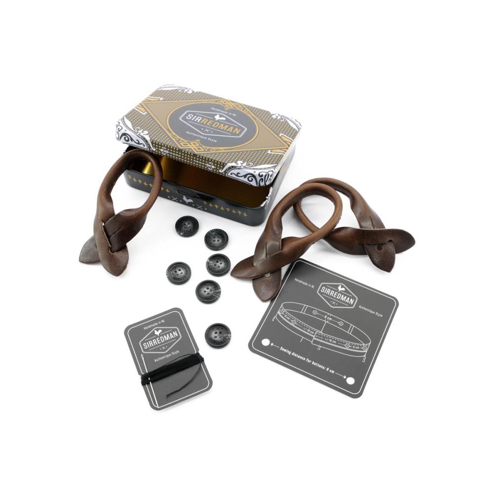 PROUDLY MADE BY HAND IN THE NETHERLANDS Sir Redman maakt zijn bretels volledig met de hand in eigen huis. Deze bretels zijn voorzien van de beste kwaliteit lederen lussen en stevige clips. Ook zijn ze in maat verstelbaar met schuifklemmen. Met het speciaal meegeleverde blikje met 6 knopen, naald & draad en een afstand bepaler om de knopen aan de binnenkant van je broek te bevestigen, is het heel eenvoudig om je bretels op de authentieke manier te dragen. Ben je daar niet zo van? Gebruik dan de hoogwaardige clips om deze aan je broekrand te klemmen. Ze zijn nl. los van elkaar afneembaar. Gebruik je de lussen niet? Bewaar ze dan in het blikje: handig toch?